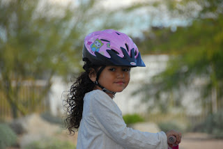 There are few things that make a Papa more proud than letting go of the back of that bicycle seat and watching your pride an joy pedal away under her own power. I'll let you in on a little tip at the end, but I knew today was the day for Nana. Beautiful Sunday afternoon in the cul-de-sac, first signs of Spring (AZ time) already coming out. We hadn't really practiced that much, just watching her scoot about though I knew she'd been ready for awhile. It just took one push and she was off. One of those difficult moments as a parent where you celebrate the accomplishment but lament that your little girl is growing up. Thankfully she still needs me; I ran to keep up and saved the day from a major spill. She can't work the break and ends up in a wobbly power skid. Thanks for the helmet Tia Mehrsa!